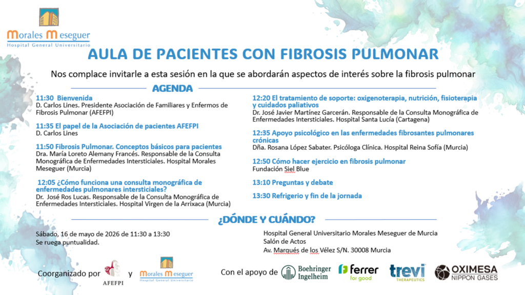 El próximo sábado 16 de mayo de 2026, el Hospital General Universitario Morales Meseguer de Murcia acogerá una nueva Aula de Pacientes con Fibrosis Pulmonar, una sesión dirigida a pacientes, familiares y cuidadores que buscan información fiable, apoyo y acompañamiento.