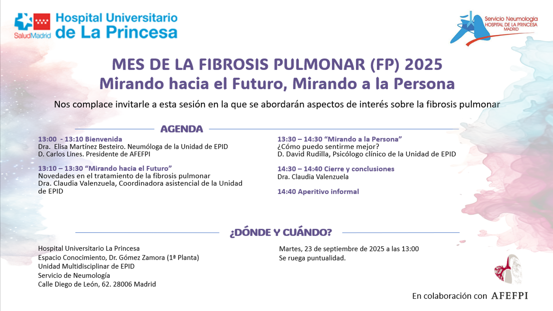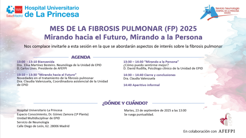 Con motivo del Mes Mundial de la Fibrosis Pulmonar, el Hospital Universitario de La Princesa organiza una sesión informativa para pacientes y familiares el próximo martes 24 de septiembre a las 13:00 h, en el «Espacio Conocimiento, Dr. Gómez Zamora» (1ª Planta)